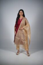 The Drape: The dupatta has enough body to hold its shape (as seen draped over the shoulder), creating a majestic “queen-like” silhouette that balances the simplicity of the green kurta.
