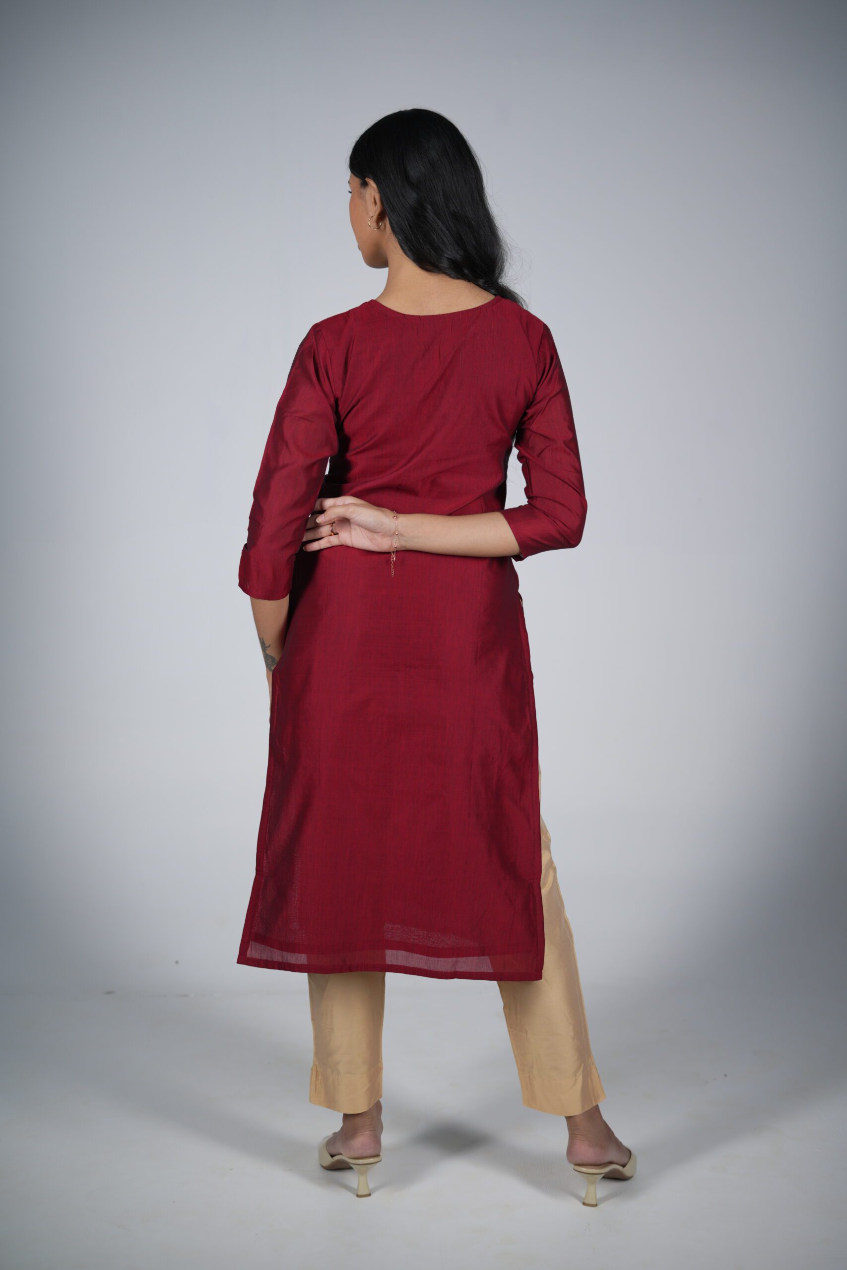The kurta is the centerpiece of the look, featuring a maroon colour (often called Arakku-pachai in traditional terms) cotton silk fabric.