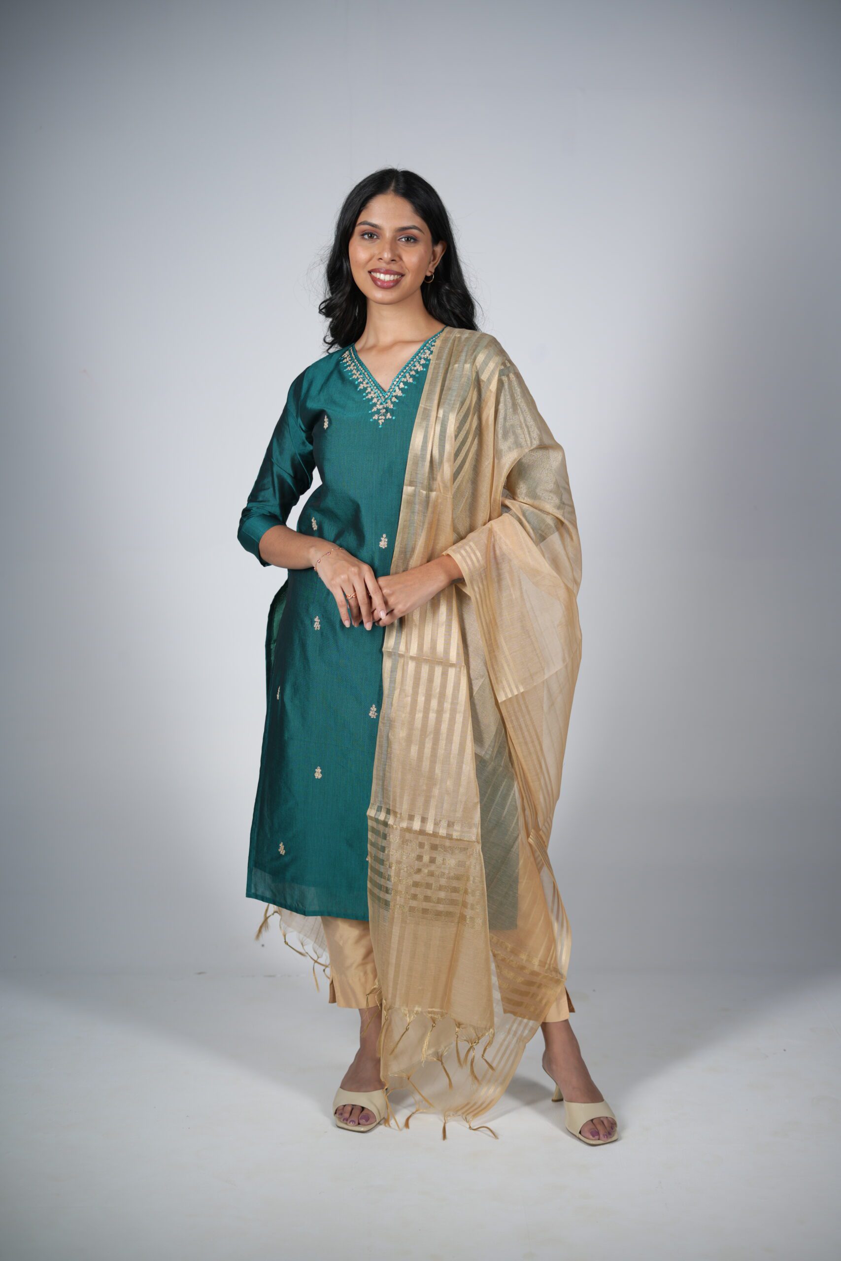 The Drape: The dupatta has enough body to hold its shape (as seen draped over the shoulder), creating a majestic “queen-like” silhouette that balances the simplicity of the green kurta.