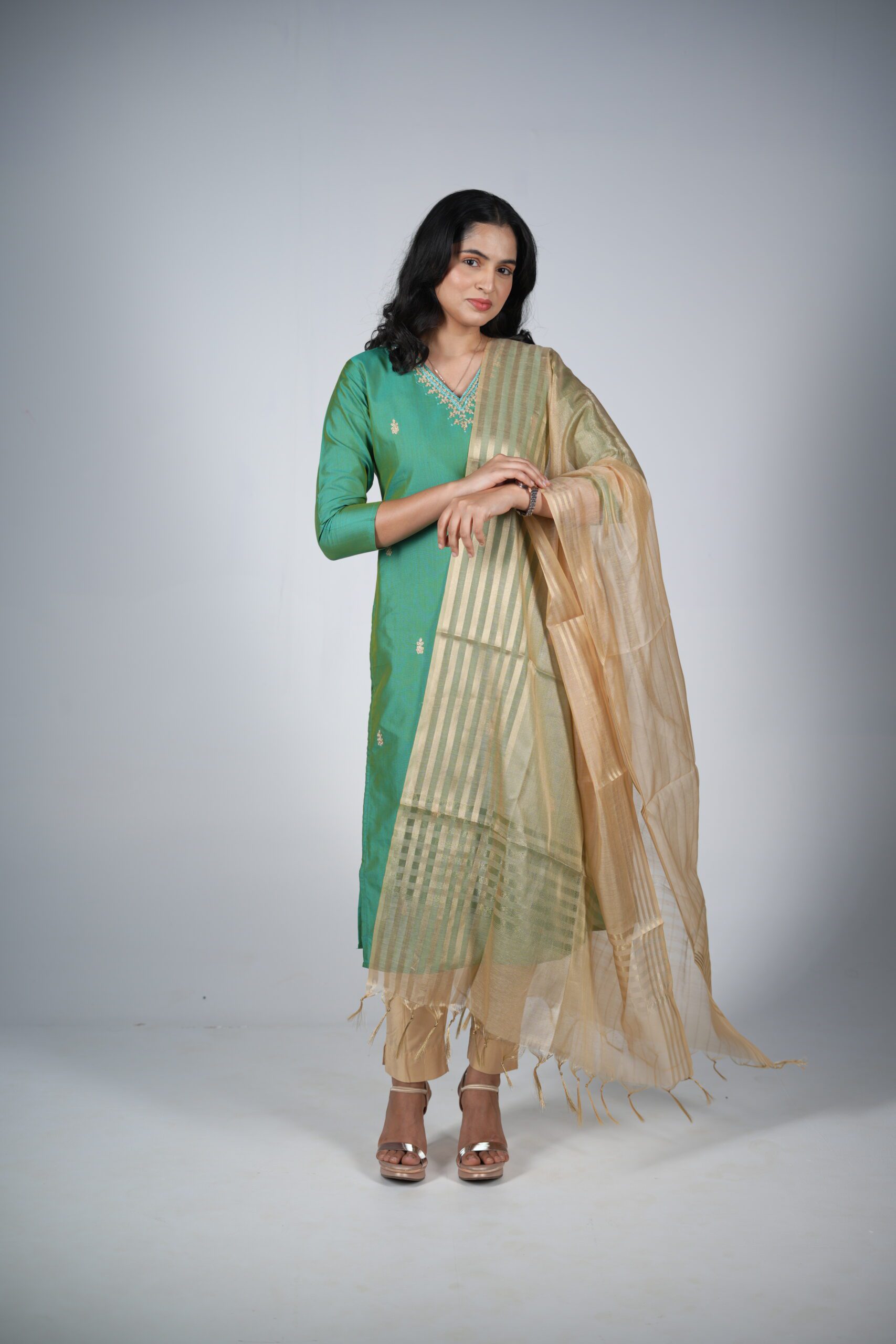 The Drape: The dupatta has enough body to hold its shape (as seen draped over the shoulder), creating a majestic “queen-like” silhouette that balances the simplicity of the green kurta.