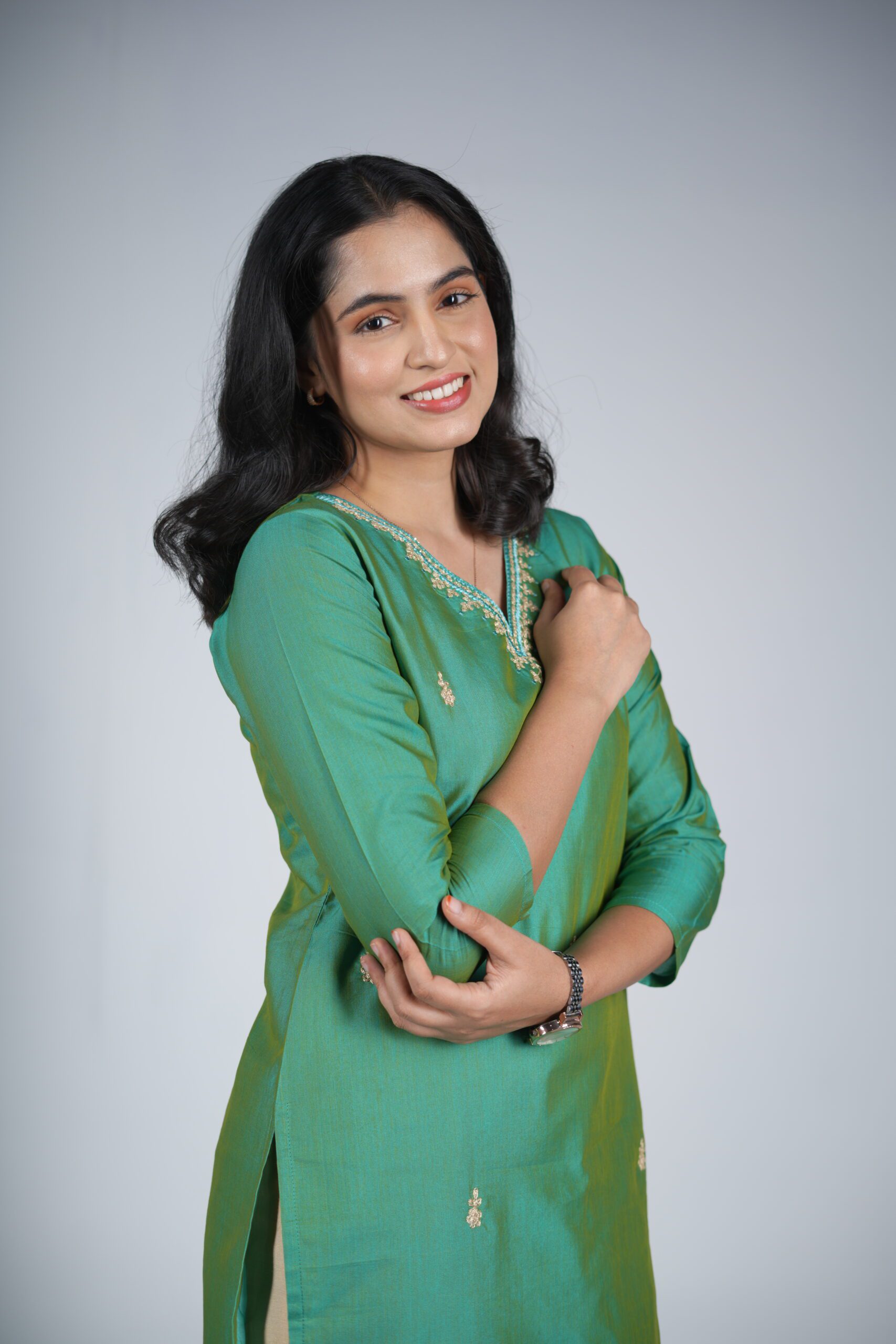 The kurta is the centerpiece of the look, featuring a rich sea-green (often called Arakku-pachai in traditional terms) cotton silk fabric.