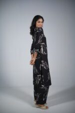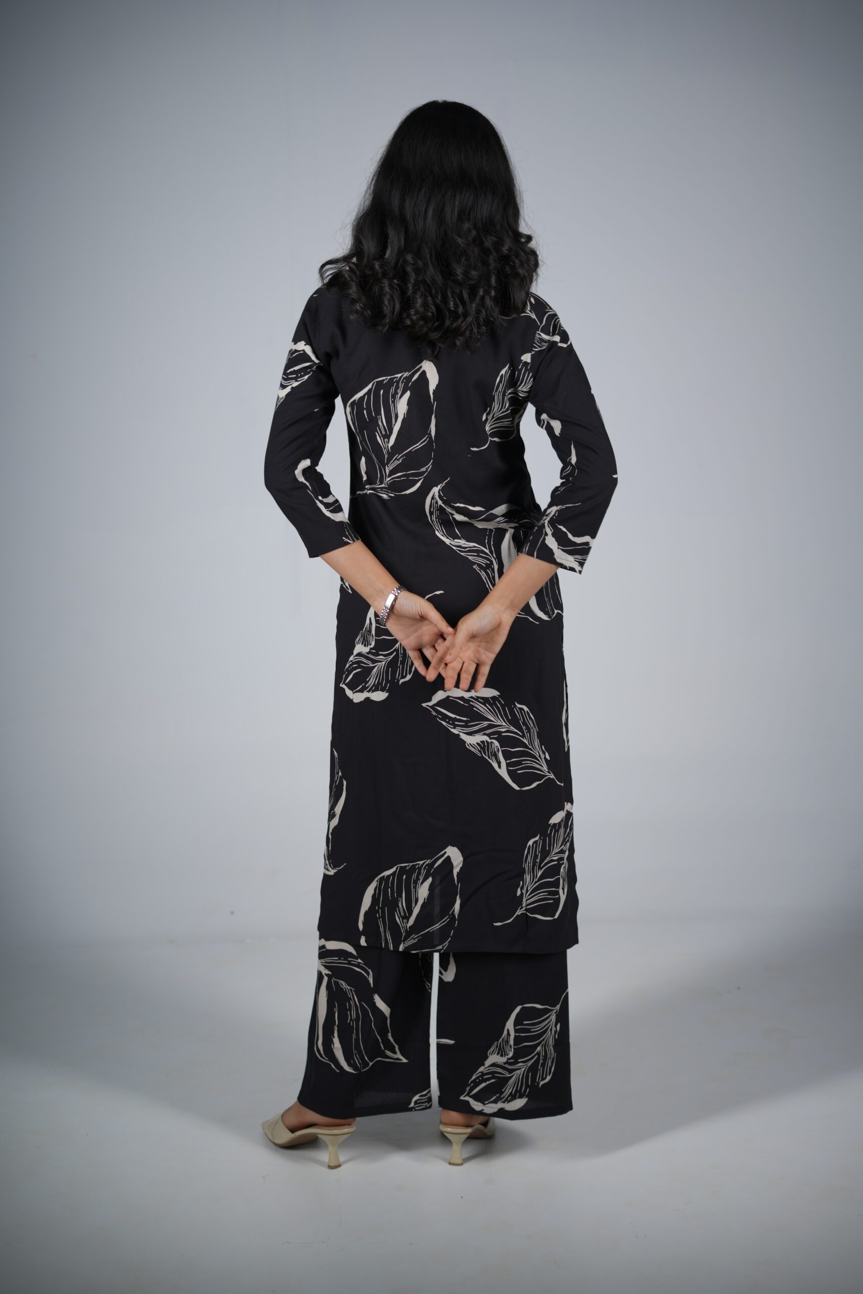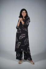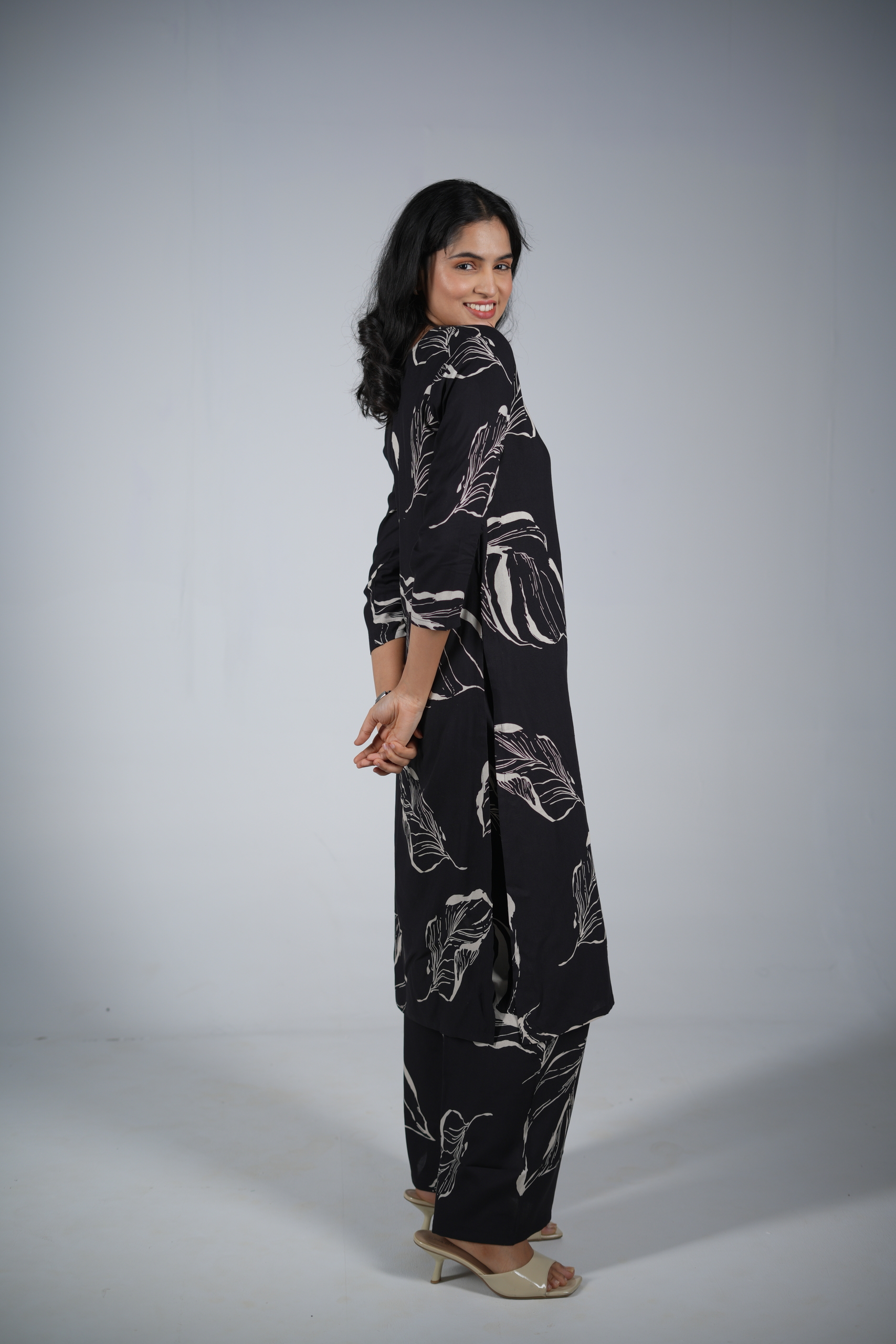 Design & Print: The kurta features an artistic leaf-motif screen print in a contrasting ivory white. These large, flowing feather-like leaves are placed asymmetrically, creating a dynamic visual rhythm that draws the eye.